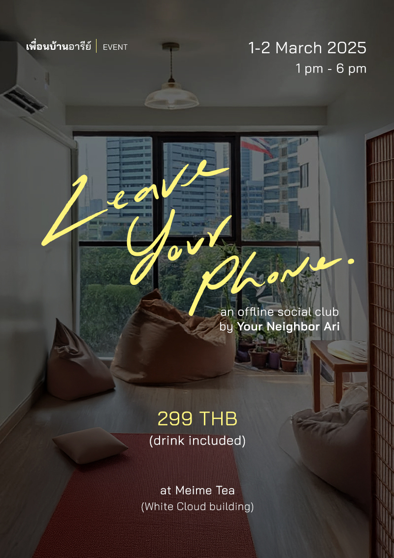 Your Neighbor Ari is back with the 3rd "Leave Your Phone" event! This time, we're heading to "Mei Mei Tea," a cozy tea shop owned by our neighbor, Khwan, who wants to invite everyone to enjoy tea, conversation, and a break from the digital world.