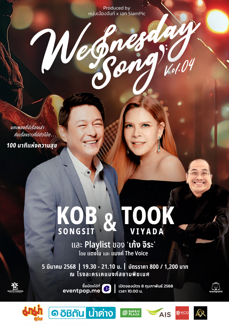 Wednesday Song ครั้งที่ 4 “กบ” ทรงสิทธิ์ รุ่งนพคุณศรี เจ้าของเพลงฮิต “ขีดเส้นใต้ - ปาฏิหาริย์ - รักเราไม่เก่าเลย - หากันจนเจอ ฯลฯ” และ “ตุ๊ก” วิยะดา โกมารกุล ณ นคร กับบทเพลงที่อยู่ในความทรงจำของทุกคน “ขอจันทร์ - เพียงแค่ใจเรารักกัน - ปล่อยใจฝัน ฯลฯ” ทั้งคู่จะมาทำให้โรงละครเคแบงก์สยามพิฆเนศอบอวลไปด้วย “ความรัก”