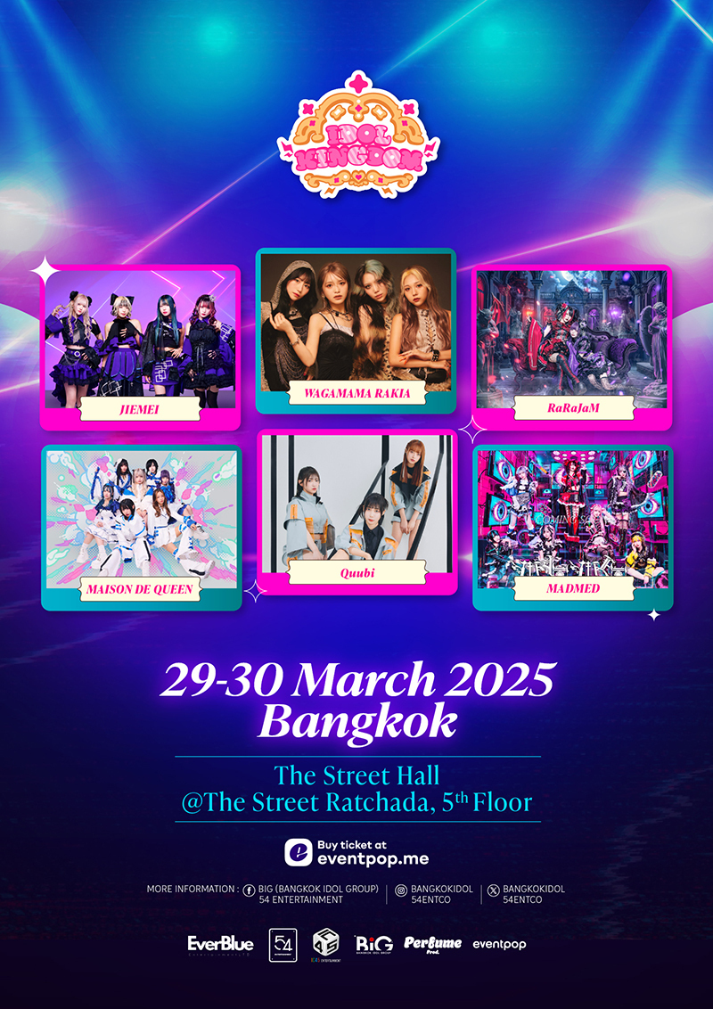 Get ready for Idol Kingdom Thailand! For the very first time, six electrifying Japanese idol groups—including Jeimei, WAGAMAMA RAKIA, Quubi, Maison de Queen, and RaRaJam—are heading to Thailand, accompanied by over 30 idol groups from all across Asia.