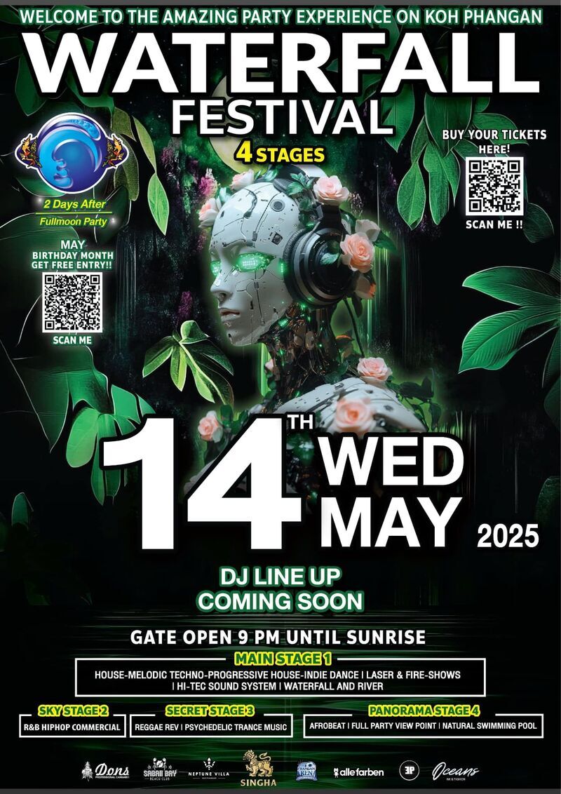 Join us for the Waterfall Festival on Koh Phangan, now celebrating two days after the Full Moon Party! Experience an unforgettable night across four dynamic stages in this incredible island setting. 🌌🎊