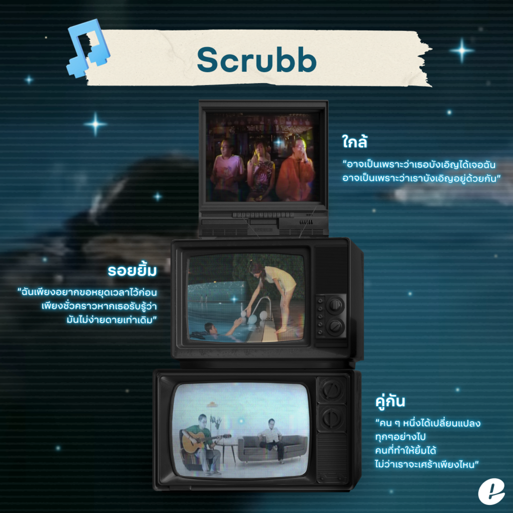คู่หูดูโอ้ “บอล-เมื่อย” ที่อยู่คู่วงการเพลงอินดี้ป็อปมาตั้งแต่ปี 2543 ด้วยจังหวะเพลงที่เข้าถึงง่ายแต่เป็นเอกลักษณ์ ทำให้เพลงของ Scrubb ยังคงถูกเล่นและกลับมาฮิตอีกครั้งในปัจจุบัน อาทิ ใกล้ รอยยิ้ม คู่กัน เป็นต้น
