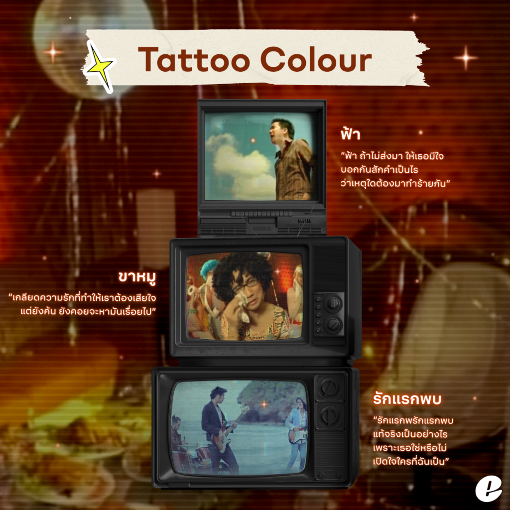 ไม่ว่าจะผ่านไปกี่ยุค เพลงของ Tattoo Colour ยังคงอยู่กับพวกเราเสมอตั้งแต่การปล่อยอัลบั้มแรกของพวกเขาในปี 2549 อย่างอัลบั้ม Hong Ser ที่ปล่อยครั้งแรกก็พาเพลง “ฟ้า” และ “ฝากที” ขึ้นเป็นเพลงเศร้าสุดฮิตติดชาร์ต และเพลงของพวกเขาก็ร่วมสมัยอยู่จนถึงทุกวันนี้ อาทิ ฟ้า ขาหมู รักแรกพบ